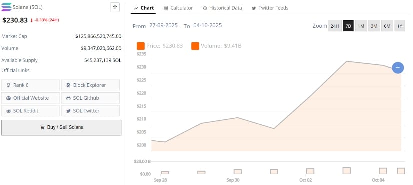 Solana现价230.83美元,24小时跌幅0.33%。数据来源:Brave New Coin