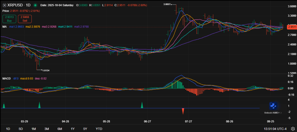 周六XRP交投于2.95美元附近,受数字资产市场普遍抛售影响下跌2.61%。全日波动区间2.91-3.03美元,呈现温和震荡行情。尽管价格回调,XRP仍坚守关键位,在年中上涨后保持着稳健的技术结构。