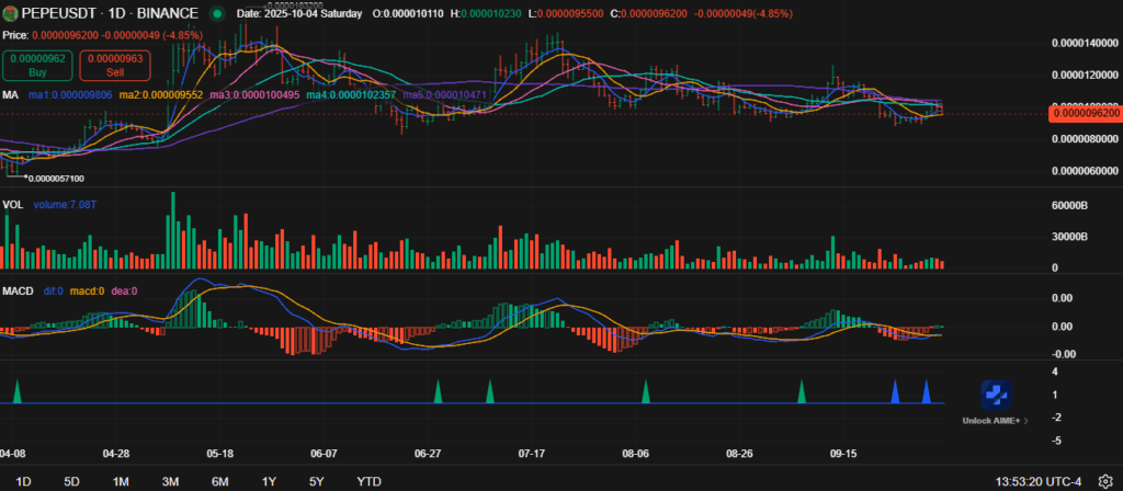PEPE在0.00000962美元附近保持稳定基调,流动性平衡环境下下跌4.85%。代币仍处于前高修正阶段,但关键支撑区域完好。近期走势显示抛压减弱,底部正逐步形成稳定平台。