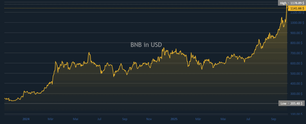 BNB延续强劲涨势,在触及年度高点1178.89美元后现报1141.66美元。该代币在年初长期盘整后的爆发性上涨,标志着市场共识的重新确立。不断上移的高点和低点,巩固了BNB在2025年大盘资产中的主导地位。