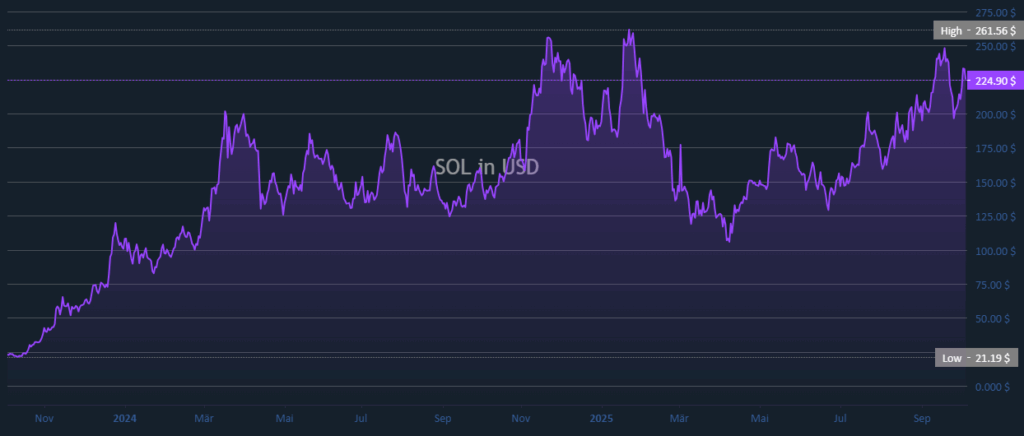 Solana重拾涨势,在经历2025年初的剧烈回调后现报224.90美元。价格结构显示自3月以来支撑位逐步上移,确认了稳定上升通道的形成。尽管前期波动剧烈,SOL仍是今年表现最优异的Layer1资产之一。