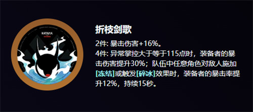 2、4件:异常掌控大于等于115点时,装备者的暴击伤害提升30%,队伍中任意角色对敌人施加[冻结]或触发[碎冰]效果时,装备者的暴击率提升12%,持续15秒。