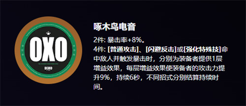 2、4件:[普通攻击]、[闪避反击]或[强化特殊技]命中敌人并触发暴击时,分别为装备者提供1层增益效果,每层增益效果使装备者的攻击力提升9%,持续6秒,不同招式分别结算持续时间。