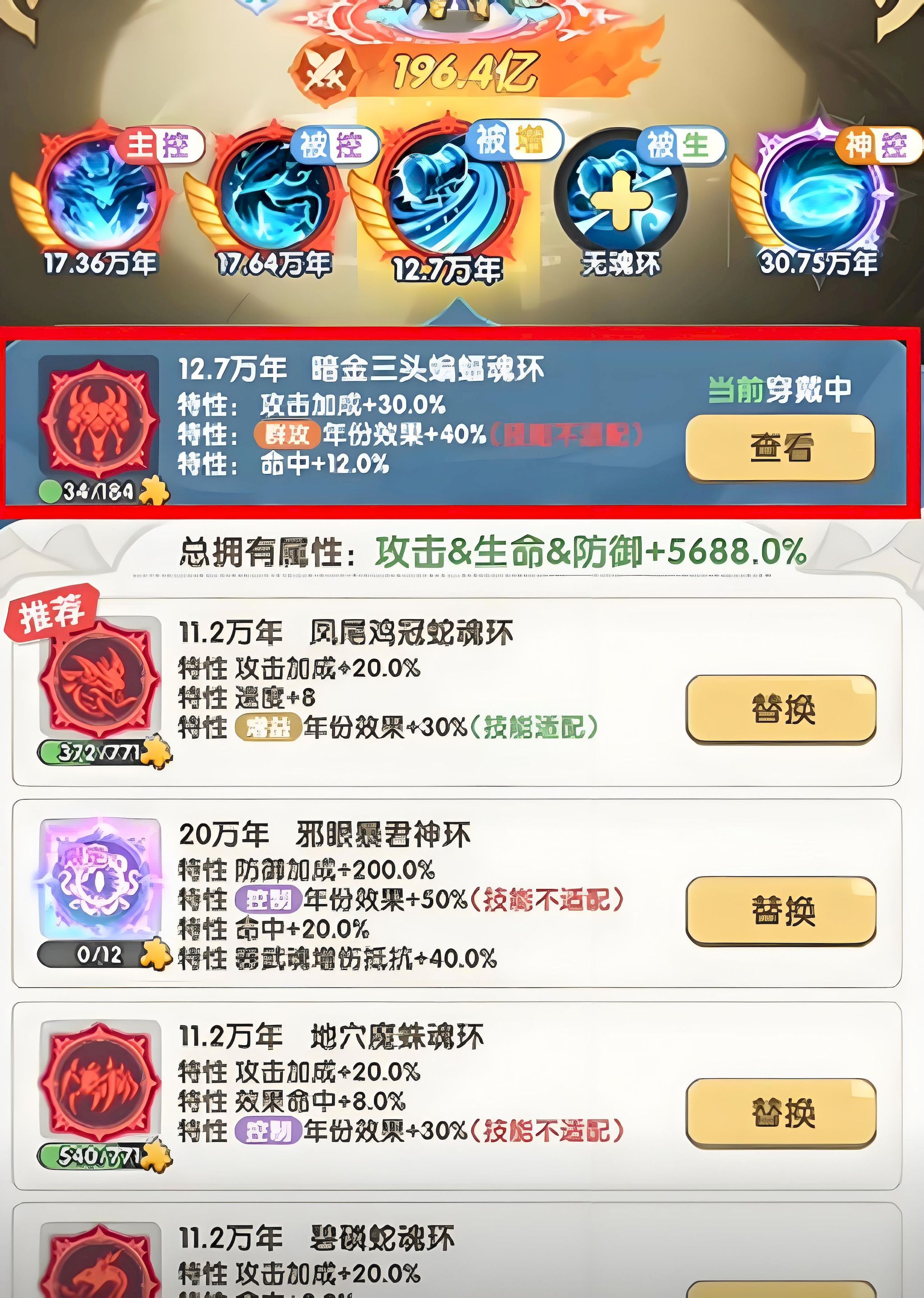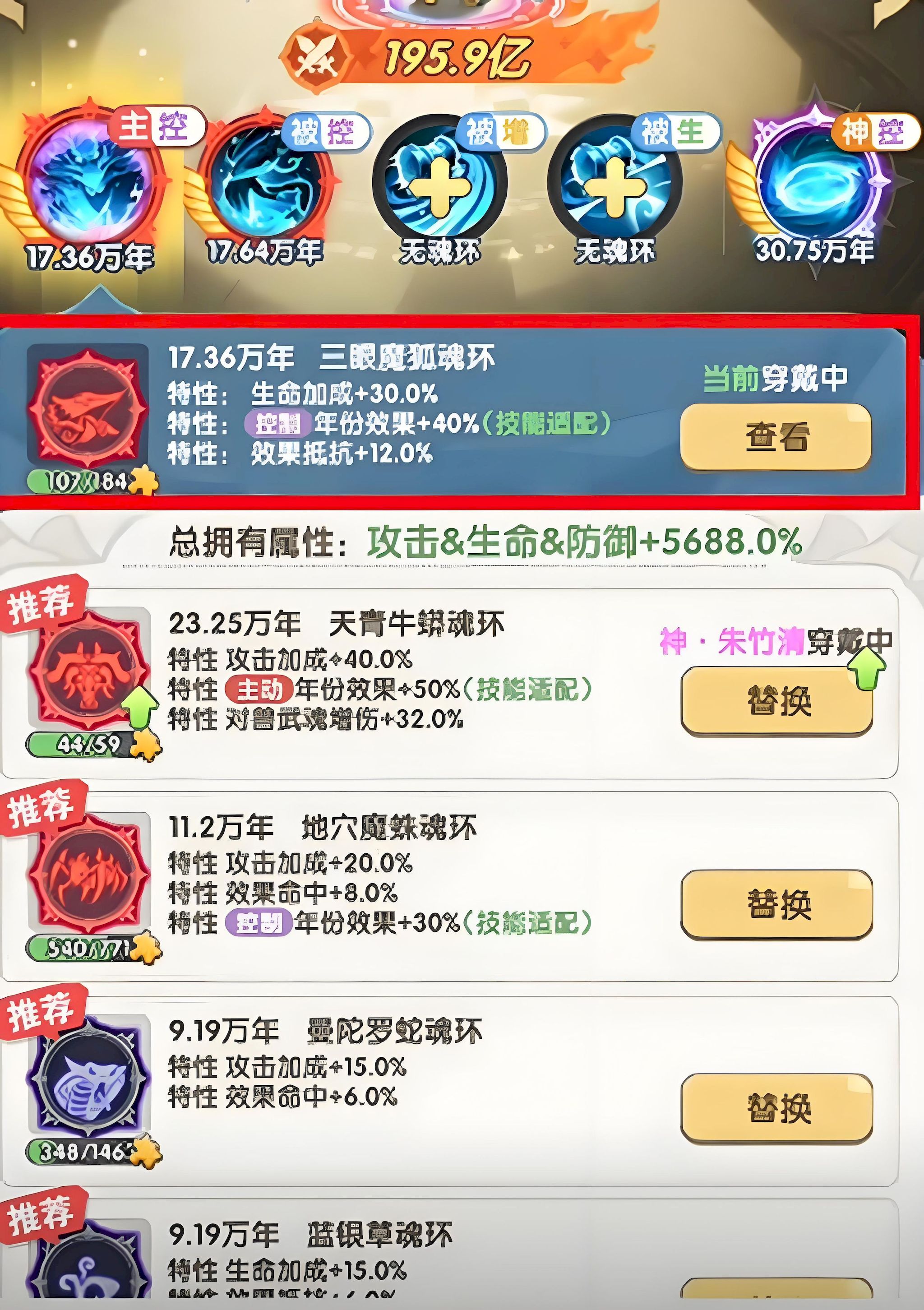 1、第一技能推荐固定搭配三眼魔狐魂环,控场效果稳定且能有效限制敌方核心输出角色,建议优先配置十万年品质,确保命中率与控制时长达到最优。