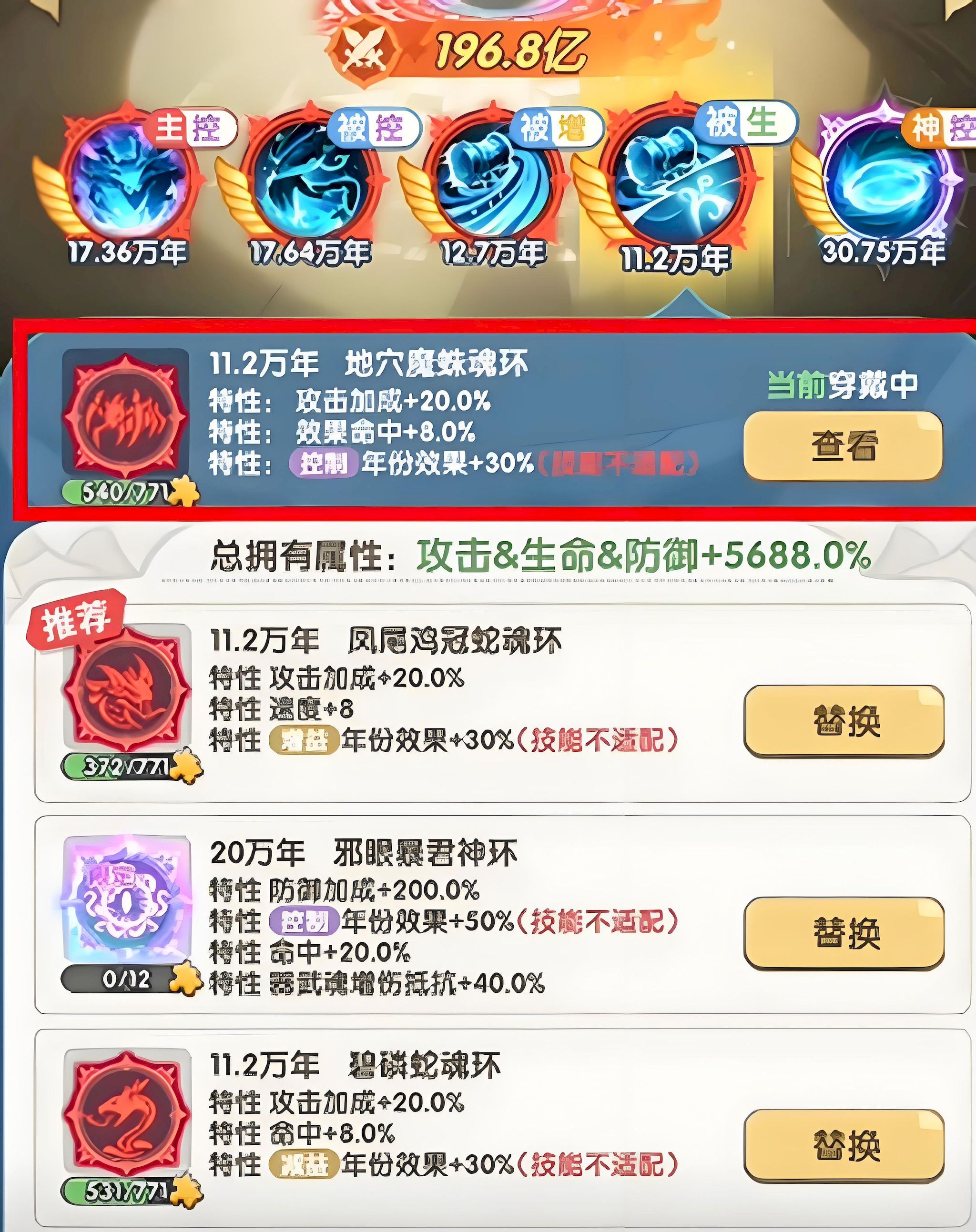4、低速后手流派第三技能换为三头蝙蝠魂环,触发更强生存能力与控制效果提升站场表现,第四技能选地穴魔蛛魂环,承受伤害后可快速反制敌方。