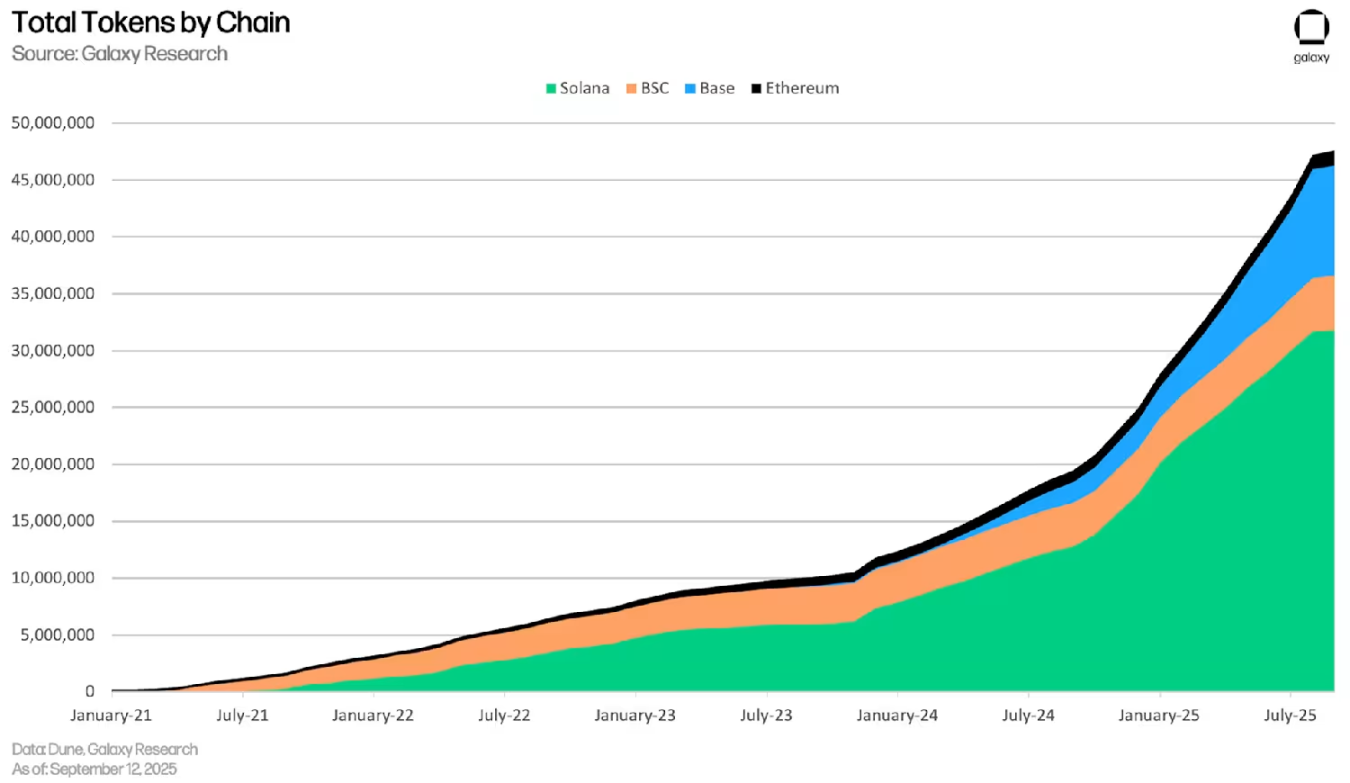 Pump.fun 彻底改变了行业格局。它首次将发行 Meme 币的门槛降至几乎为零:只需几美元,无需任何程式设计技能,任何人都能创建一种可即时交易、具备流动性且基于「绑定曲线」发行的代币。这标誌着 Meme 币领域发生了结构性转变 —— 代币发行量激增,而发行平台也成为了「新的主流模式」。
