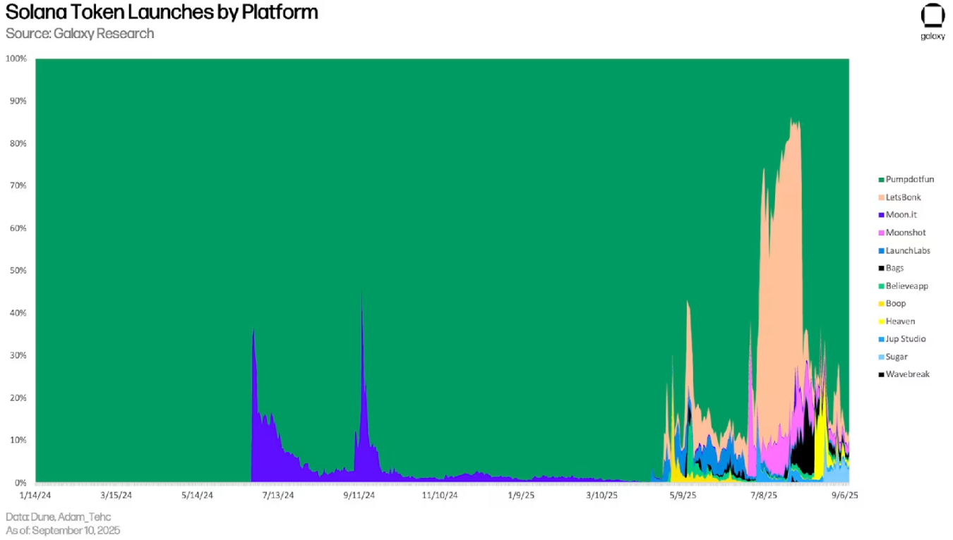 接下来,我们分析不同 Meme 币发行平台的竞争格局。今年夏天,Pump.fun 曾短暂被 Bonk.fun 夺走部分市场份额,但此后重新夺回了 Solana 代币发行市场的绝对主导地位。发行平台领域的竞争异常激烈:新平台不断涌现,试图通过调整激励机制或优化品牌定位实现差异化竞争,但这些竞争优势往往转瞬即逝。