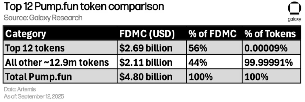 换句话说,仅佔 Pump.fun 代币总数 0.00009% 的少数代币,掌控着该平台的大部分价值。