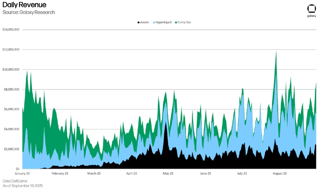 儘管多数 Meme 币交易者都在亏损,但搭建交易生态的基础设施方,却赚走了市场中的大部分价值。下图对比了 Pump.fun、Axiom 与 Hyperliquid(虽不专注于 Meme 币,但为便于对比仍纳入统计)的收入情况。值得注意的是,Axiom 团队规模极小(不足 10 人),却通过向 Meme 币交易者收取手续费,实现了每月数百万美元的收入规模。