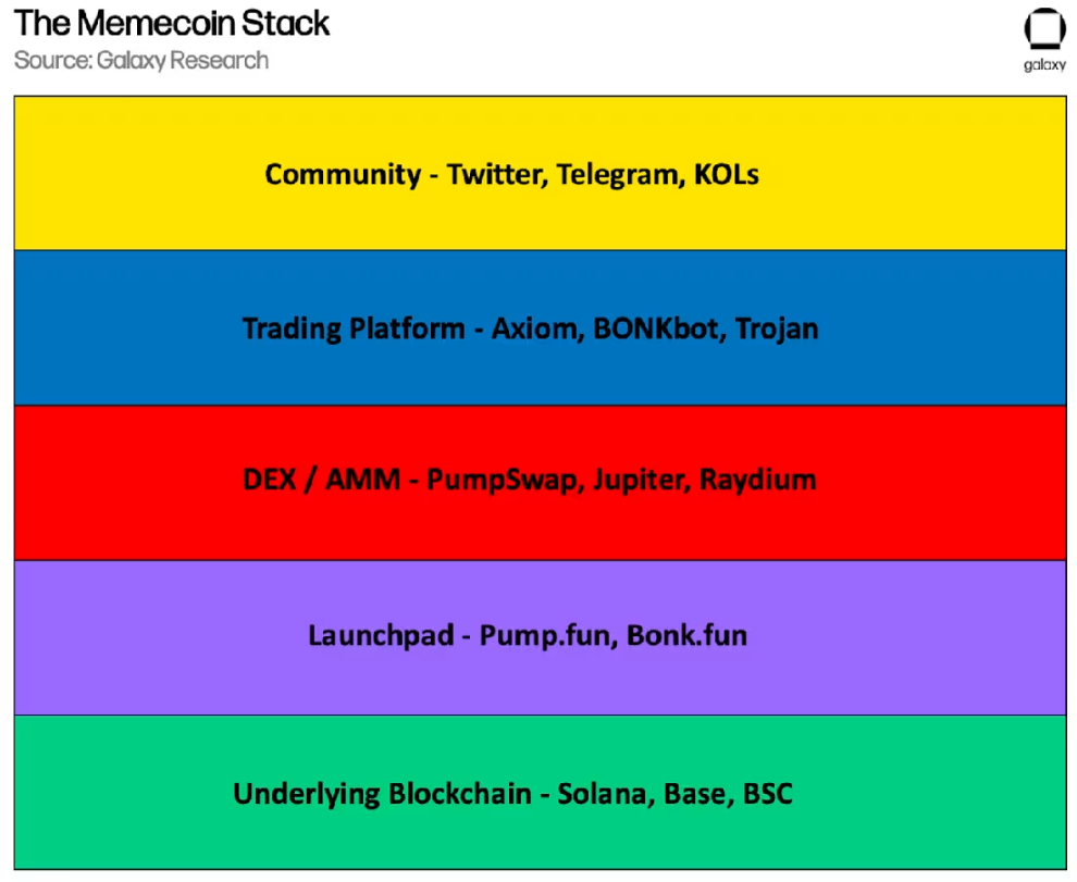 Meme 币生态系统可被理解为一个分层的「生态栈」,每一层都建立在下层的基础之上: