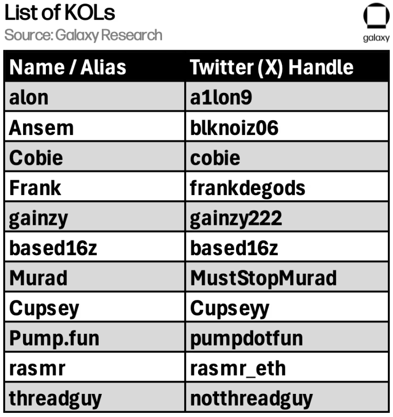 由于 KOLs 在「捧红」或「扼杀」Meme 币方面影响力巨大,以下列出了一批在 X 平台上推动 Meme 币叙事的核心活跃帐号(非详尽列表):