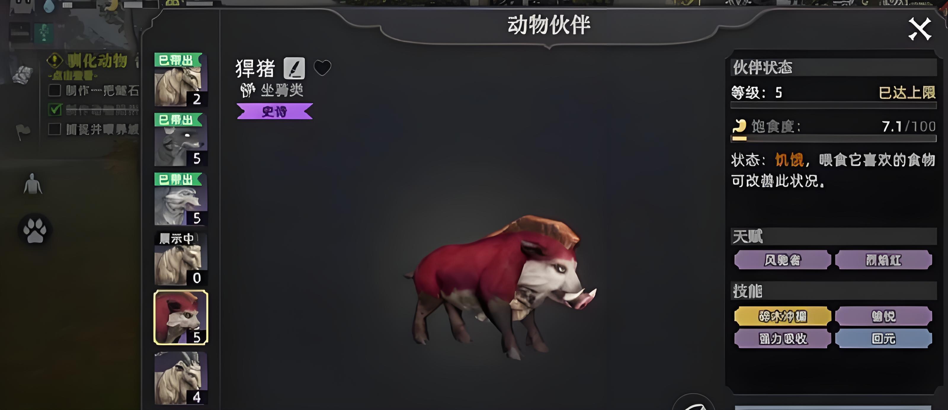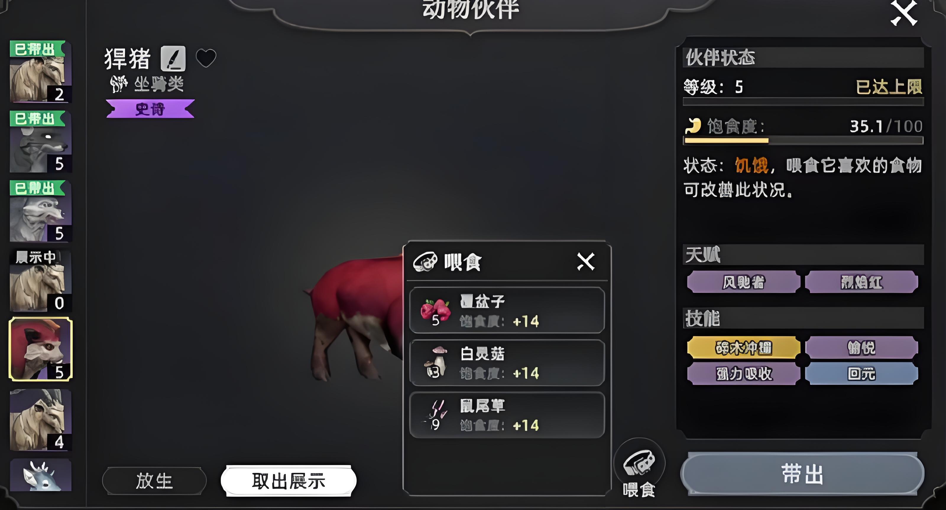4、骑乘期间要关注饱食度,数值过低会影响移动速度与技能,定期喂食野果可维持稳定状态保障使用。