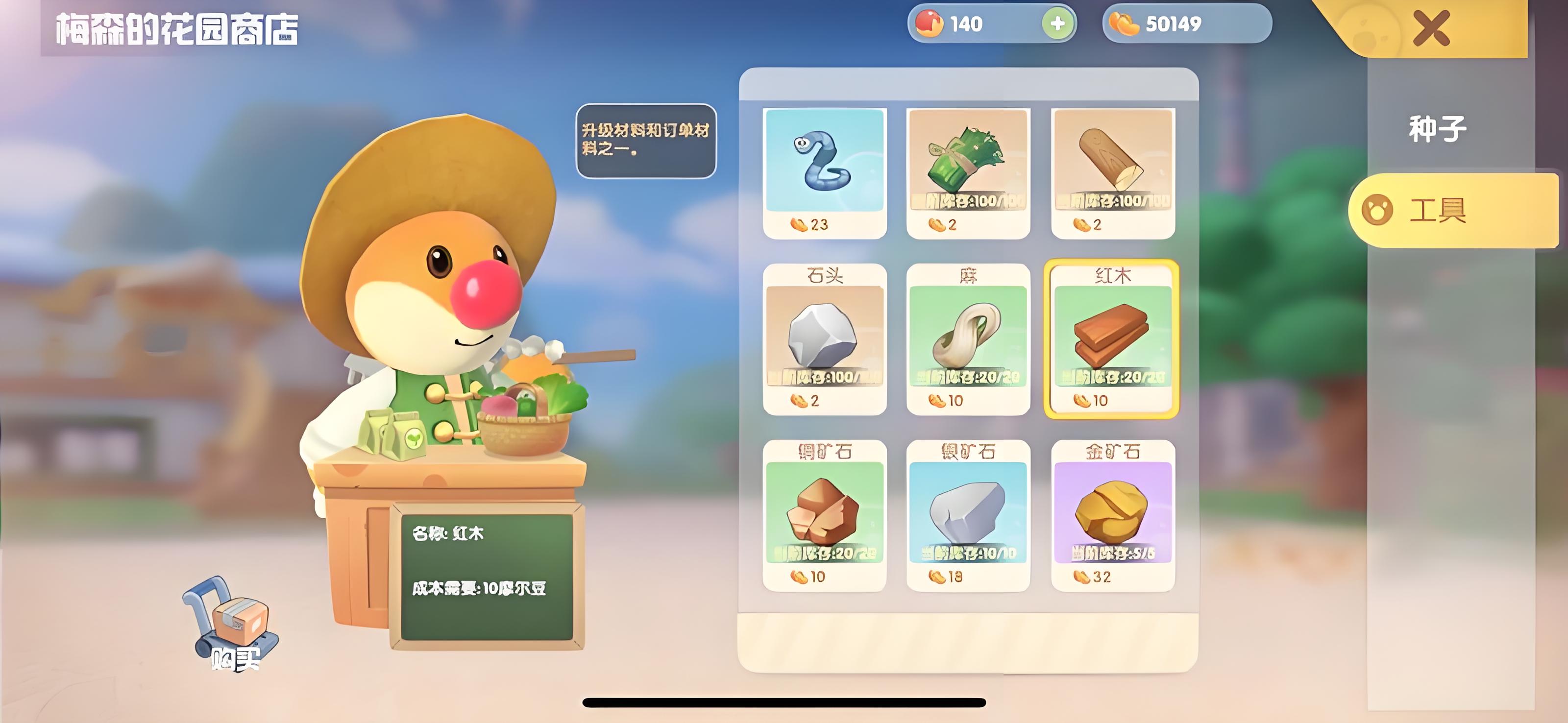2、商店消耗品栏目中可找到红木,每份售价10摩尔币,农场主可积攒游戏货币购买,参与活动还能获取更多摩尔币用于兑换。