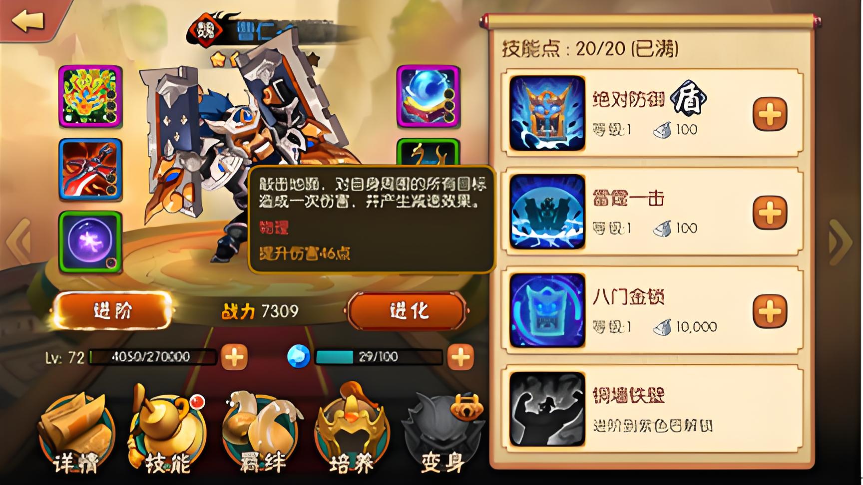 2、大技能绝对防御架巨盾抵御伤害,抵挡贯穿技能,强制随机目标攻击自己,1级吸收物理与法术伤害450点。