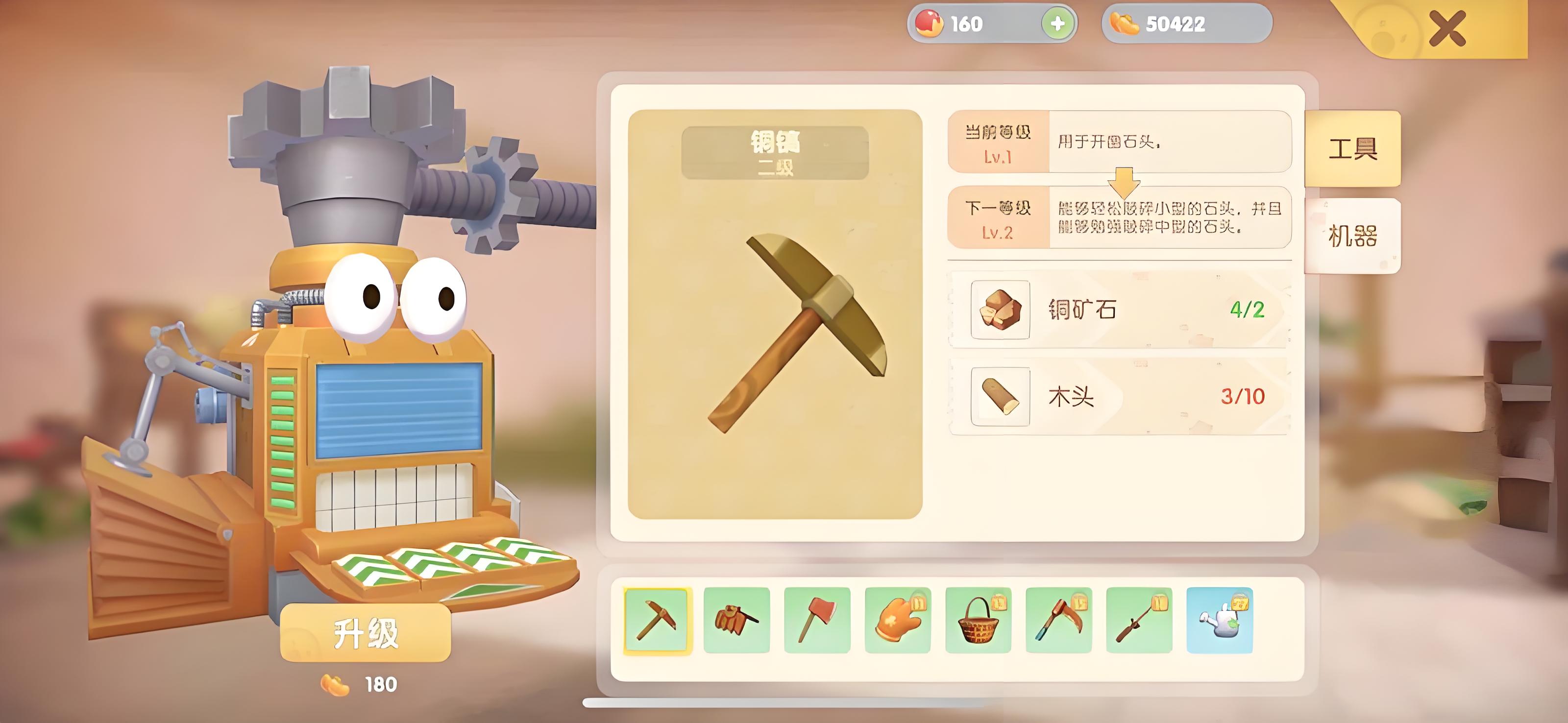 2、体积较大或表面镶嵌金属的高级石块,需使用升级后铁镐,玩家前往梅森小屋升级铁镐,升级需准备铜矿石和木头,升级后才能处理这类大型石块。