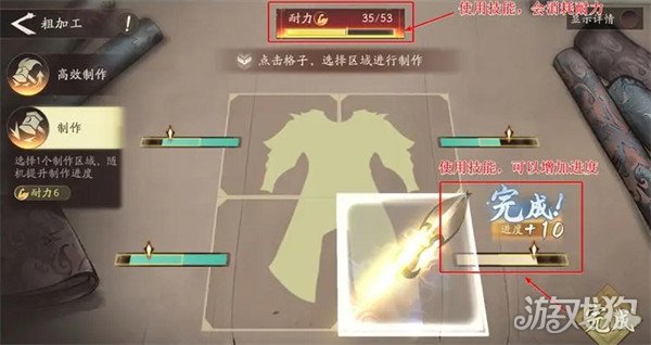 而锻造的难点一般就是火候控制,也就是第三步温度变化那个环节,需要大家观察进度条上的绿色、红色刻度。如图4的指针停在绿色区域时点击淬火,可额外增加5%橙装概率,超过进度条变红直接损坏,而且进入红色区域,即使使用固灵石锁定词条,装备基础属性也会降低8%。将温度控制在65到75中间,淬火成功率是最高的,配合下图也就是第二步选择上面的高效制作,能提升传说装备产出率,而且“指针停稳后再点击”是官方提示,大家别忽视,手速快反而容易出瑕疵装。