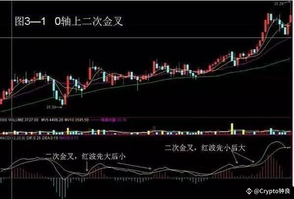 在 0轴线上,白黄线出现“金叉”后,又出现“死叉”,但不下穿O轴线,几日后在O轴线上再次出现“金叉”,为“轴线上二次金叉”。此形态是主力洗盘所为,短 暂盘整后,股价将上扬,可视为积极介入的信号。如果第一次“金叉“后的红波小(红柱短且不长),第二次红波大预示较好的买入时机。
