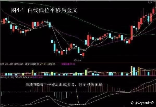 在O轴下,白线处于较低位置且不再下行,开始呈横向水平移动,而此时股价继续处于下跌状态,这已开始预示股价见底,一旦白线平移结束,开始向上“抬头”形成金叉,是买入股票的最佳时机。