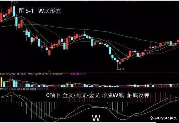 股价下跌行情中,在O轴线下,白线处于某一低点后向上,随后相继出现“金叉”,又出现“死叉”,其轨迹上在一个不同水平线上形成“W底”(双重底)的走势,当再出现“金叉”,既后(右)底出现时,预示见底反弹信号,可积极买入。