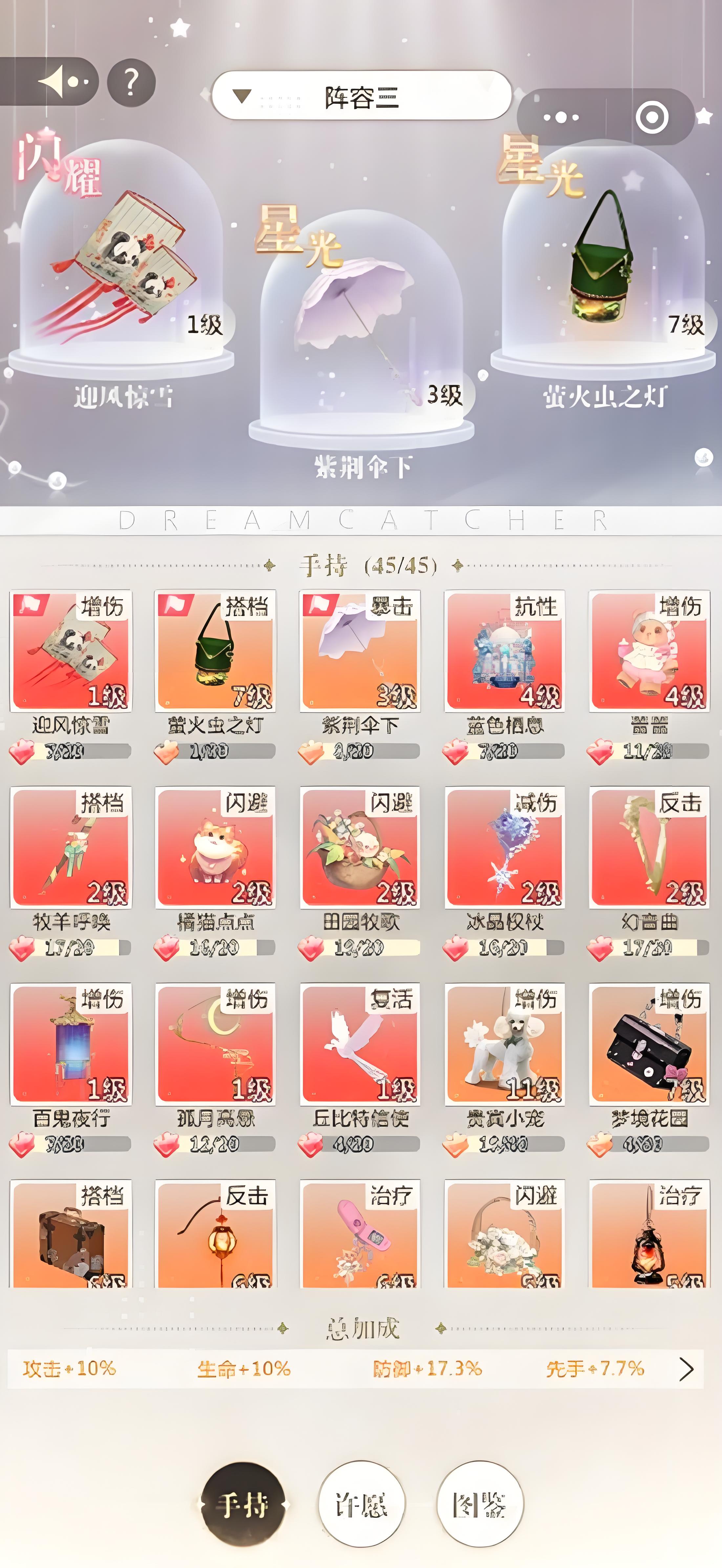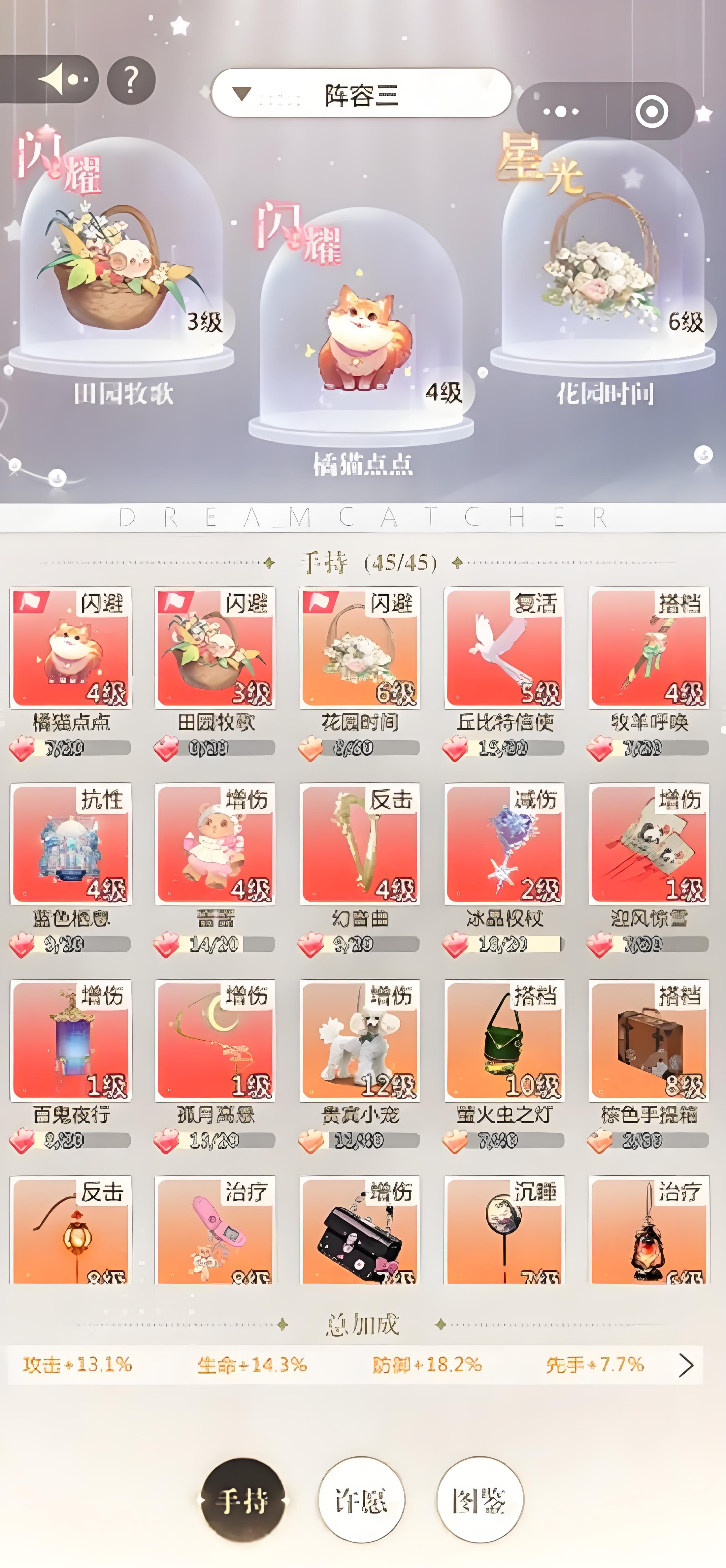 3、第二套选大梦小姐服饰主打闪避提升,闪避时触发主位搭档技能,手持选高闪避率的田园牧歌橘猫点点花园时光需3200万入梦能力。