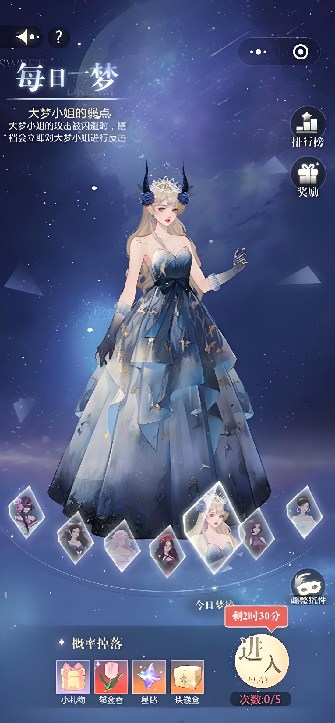 1、第一套选美梦公主服饰,携带暴击搭档和奶妈搭档,手持用迎风惊雪紫伞下萤火虫之灯,后期换输出搭档需1700万入梦能力。