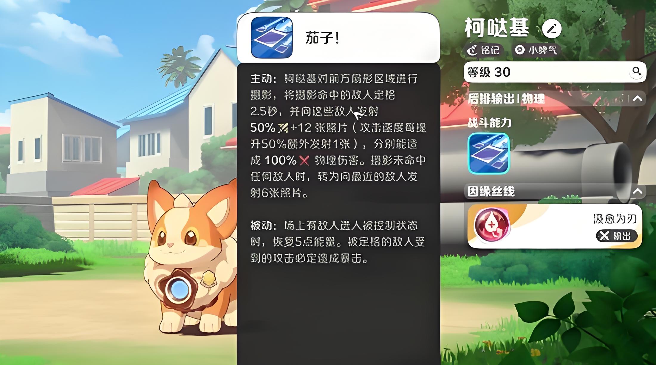 1、基定位后排物理输出,核心技能茄子对前方扇形区域摄影,命中敌人定格2点5秒,期间以50%基础攻速发动12段攻击,攻速每升50%追加一轮连击。