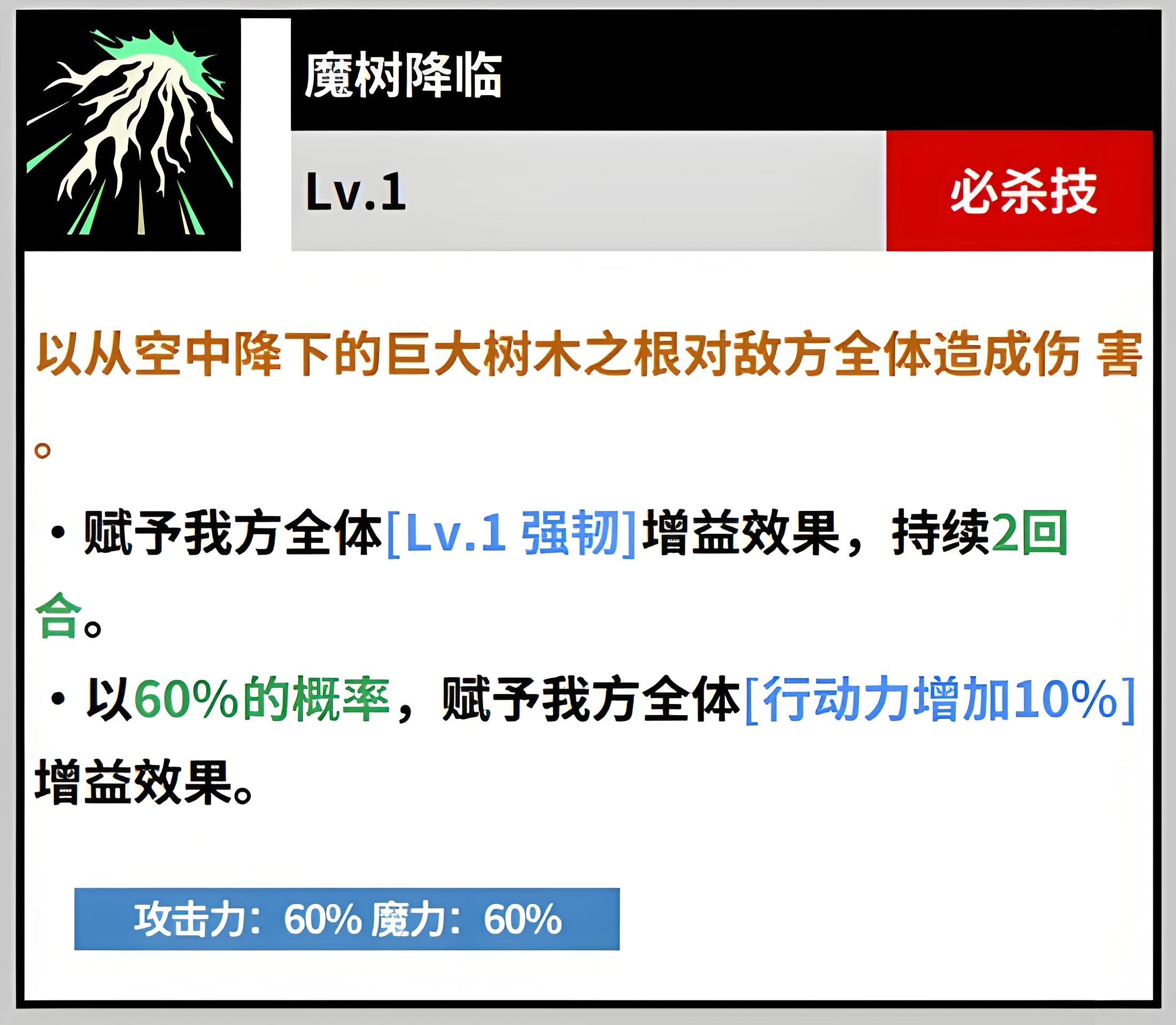 3、魔树降临是终极技能,对敌方全体造成范围伤害,给我方攻击力最高角色施加强韧状态,该角色受攻击会反击且减伤。