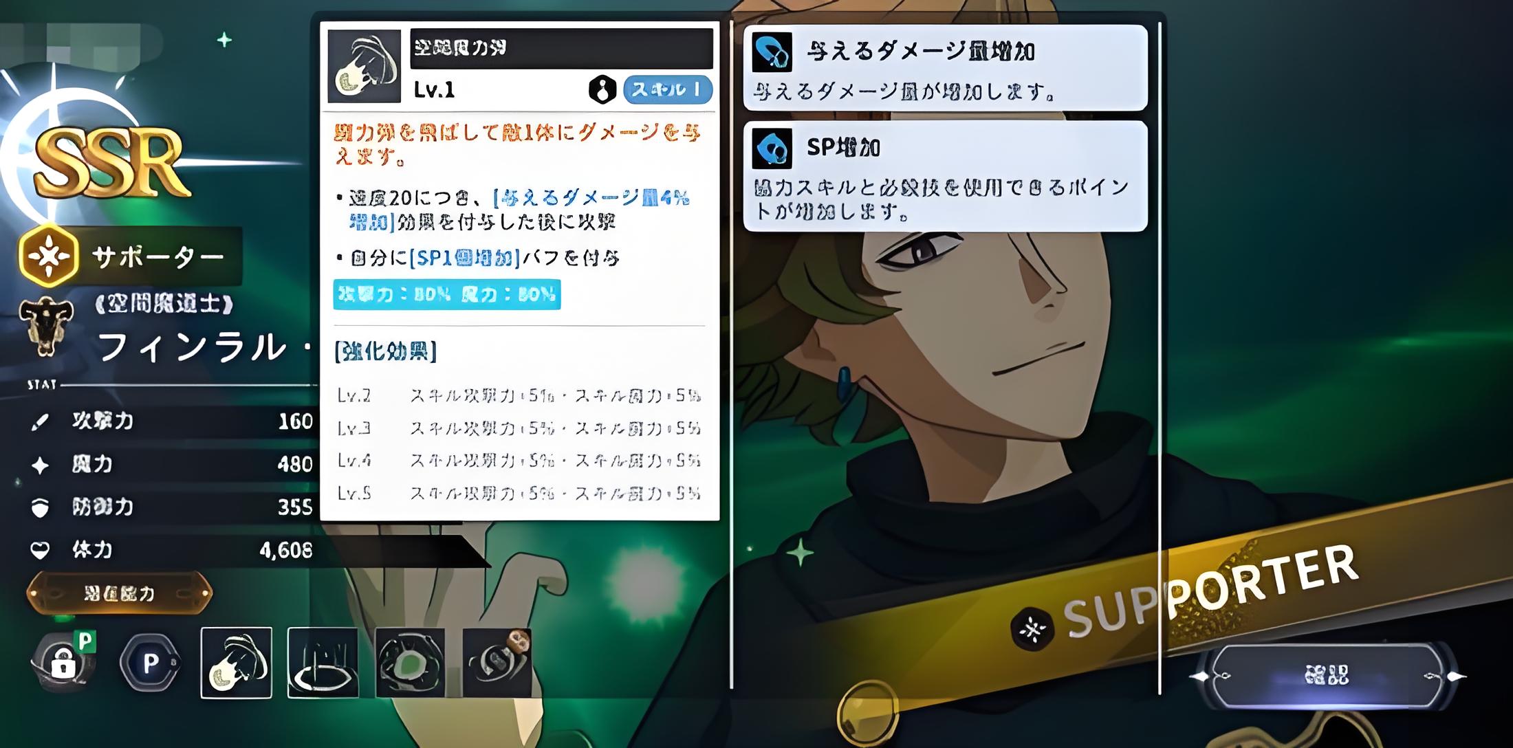 2、核心输出技能空间魔力弹对单个敌人造成魔攻伤害,速度提升会增加伤害还能为自身回复SP,提升技能循环能力适配持续战斗节奏。
