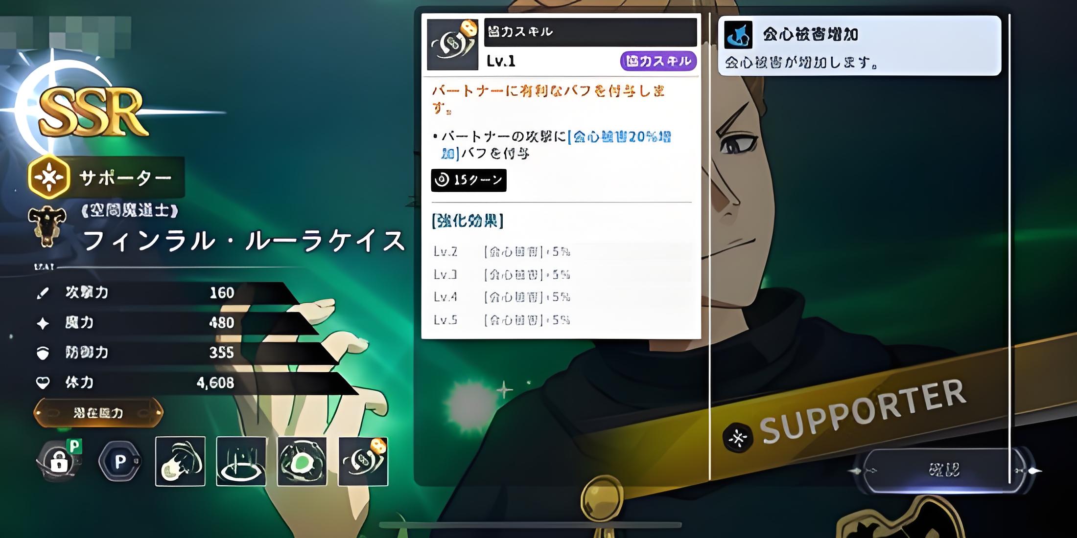 4、协力技能为团队提供会心伤害加成,技能等级提升后加成比例提高,与紧急支援联动搭配高会心主C可实现伤害翻倍效果。