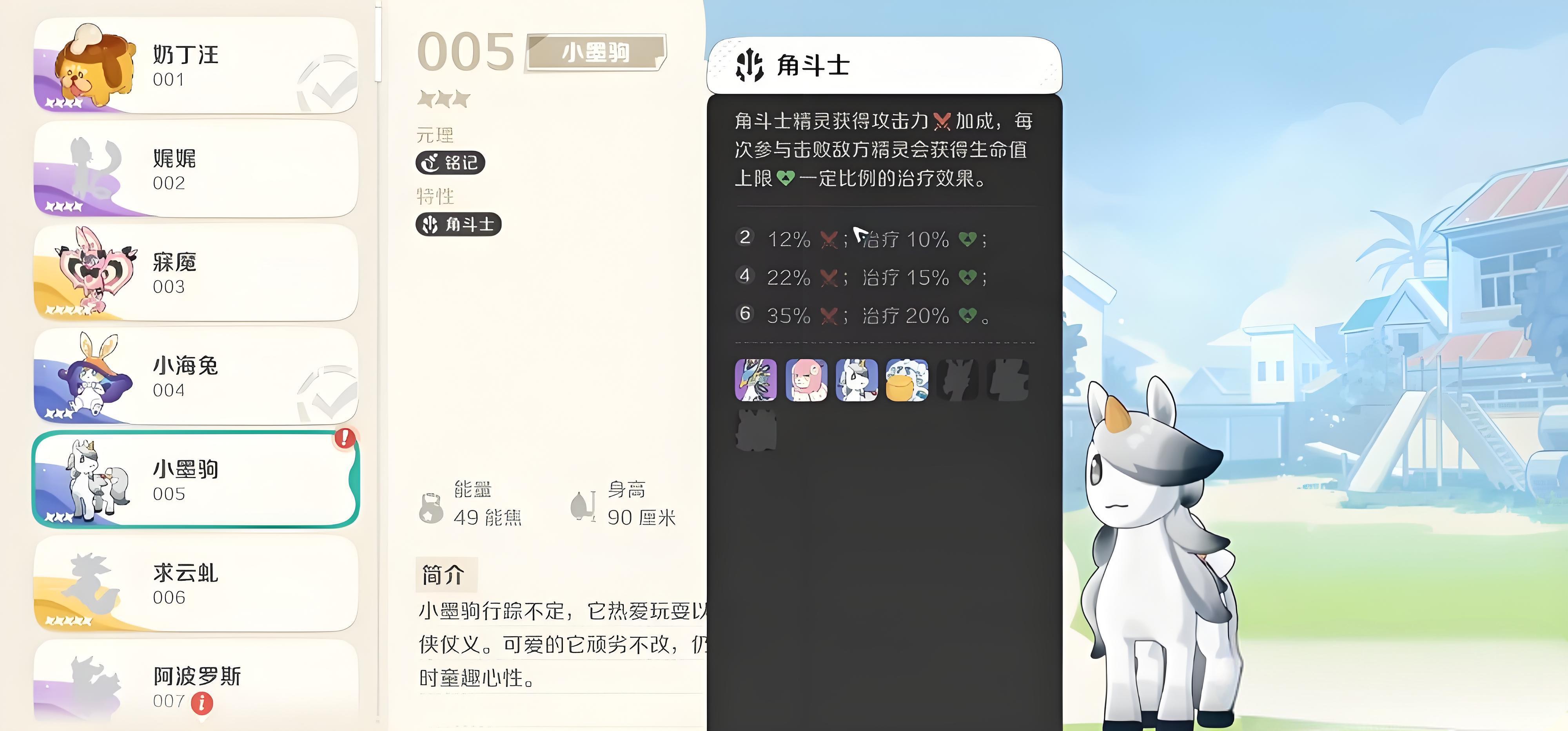 4、定位前排承伤且为物理属性,当前搭配存在一定局限,但后续若推出更多适配精灵,其搭配空间会扩大,适合需兼顾治疗与前排伤害的队伍。