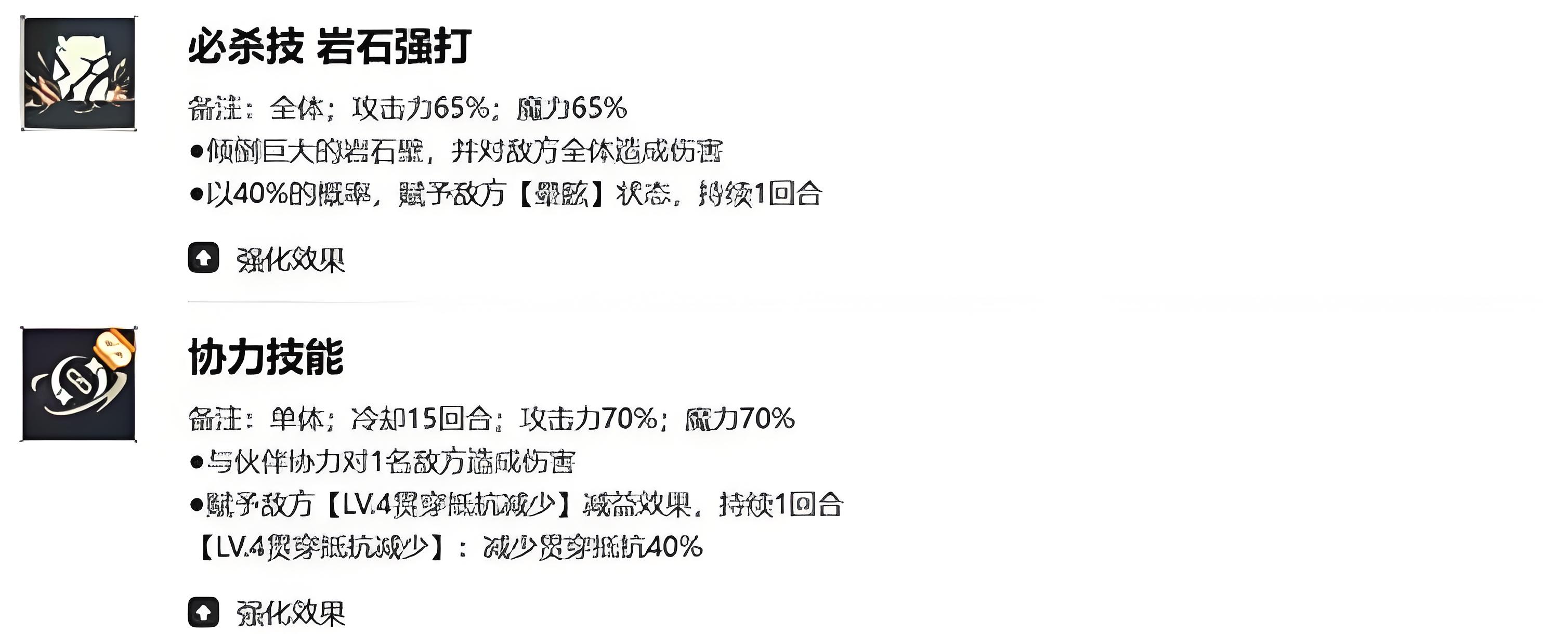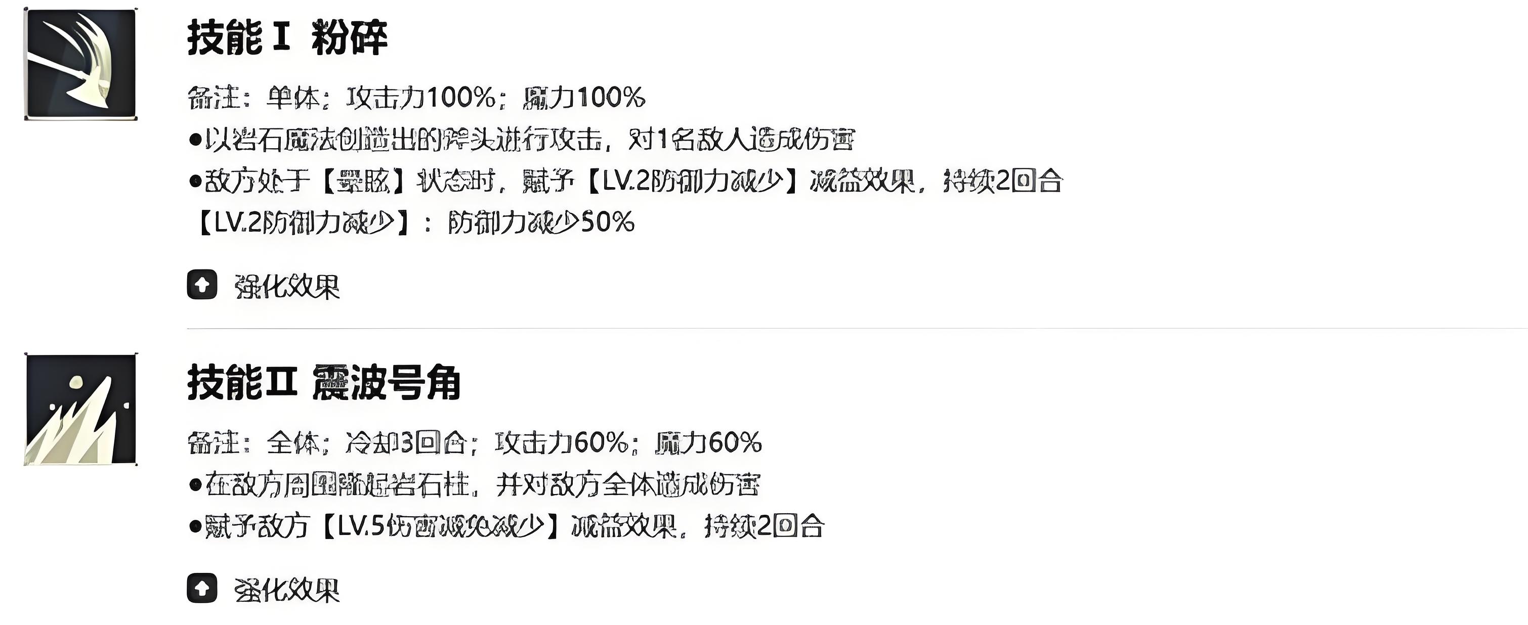 2、她的技能各有特点,粉碎对单体造岩石伤害且敌方晕眩时附加防御降低,震波号角对全体造伤害并减伤害减免,岩石强打群体伤害且有概率致晕眩。