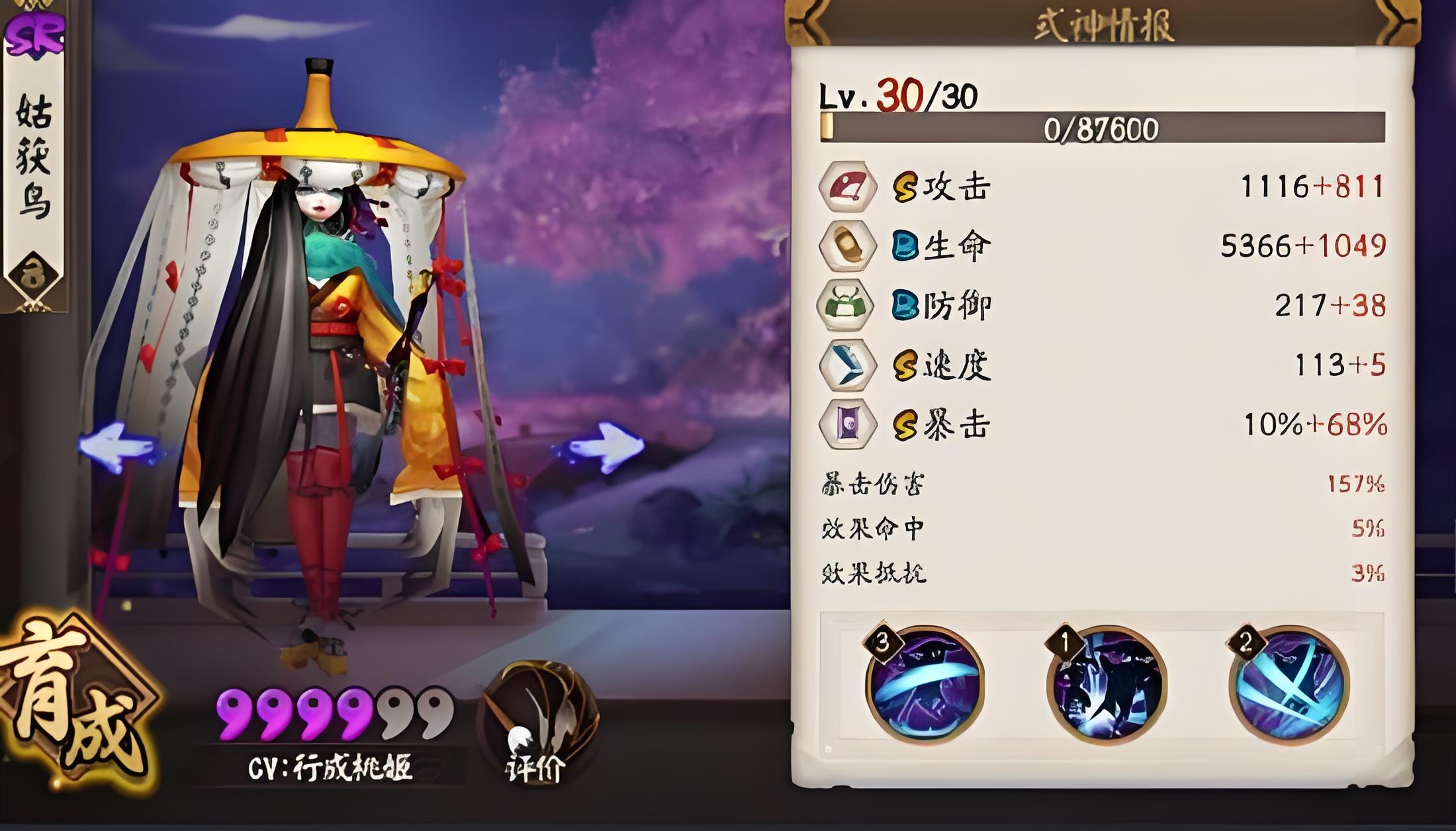 4、二号位速度属性让姑获鸟在PVP和PVE中都能抢先出手,便于顺利用魂火释放必杀技,四号位攻击百分比后期收益随式神等级提升更明显。