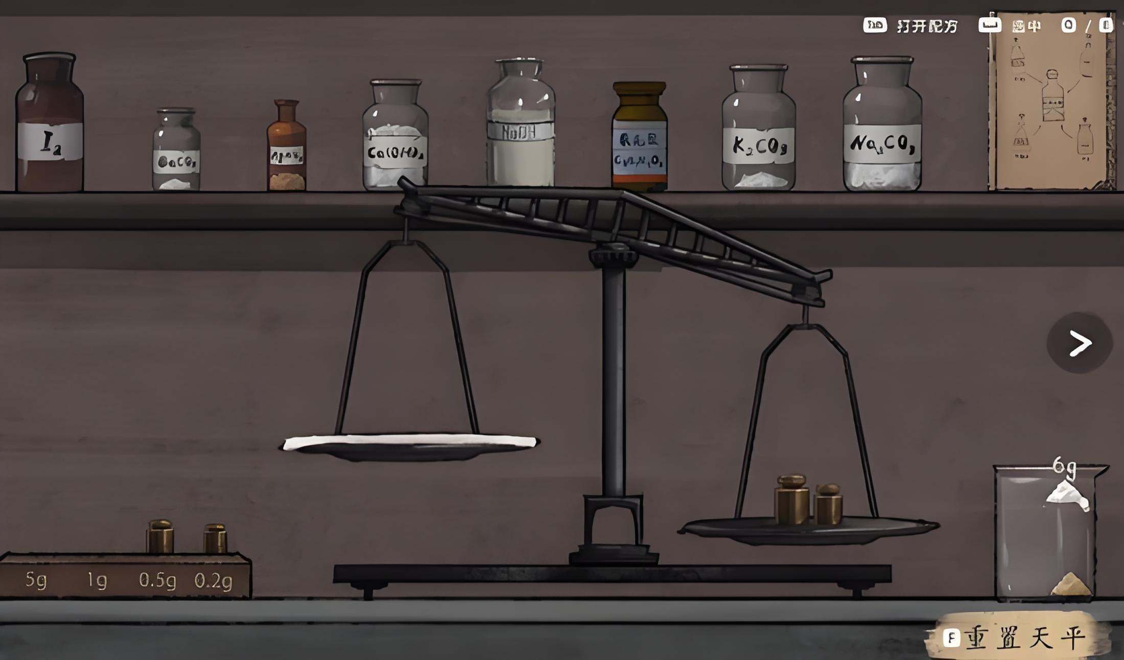 1、配置前需先进入工厂场景,找到并打开场景内的试剂台,该试剂台左侧为药品放置区且配有不同重量砝码,右侧用于放置最小单位砝码。