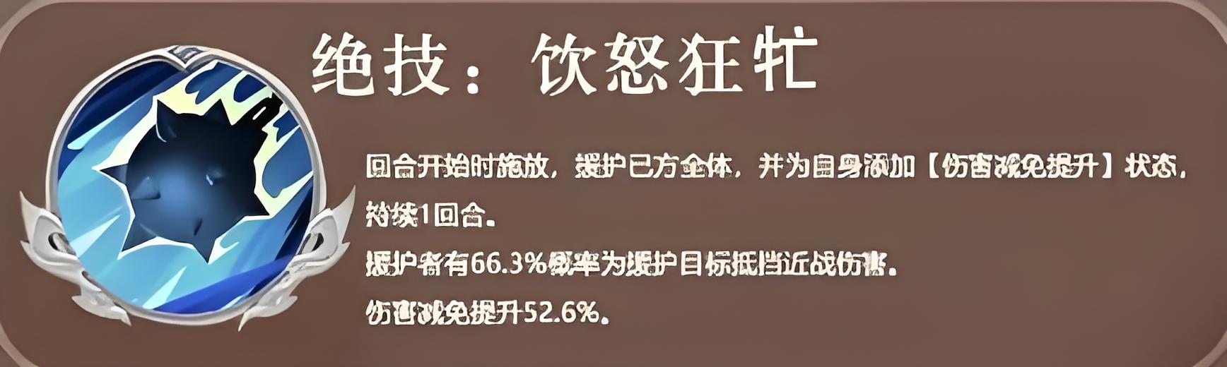 2、绝技饮怒狂忙在回合开始时施放,援护己方全体并为自身加伤害减免提升状态,持续1回合,援护者有概率为目标抵挡近战伤害。