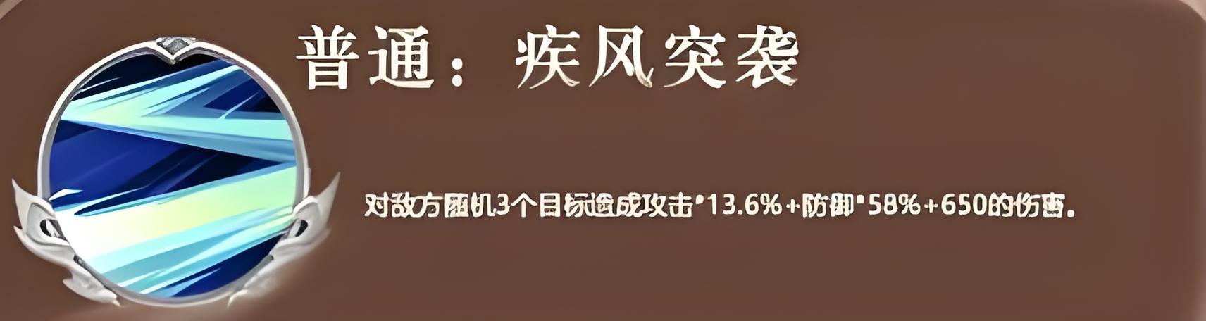 4、普通疾风突袭对敌方随机3个目标造成伤害,觉醒元气宁心可提升援护效果,援护失败时为目标分担伤害且援护时免疫控制。