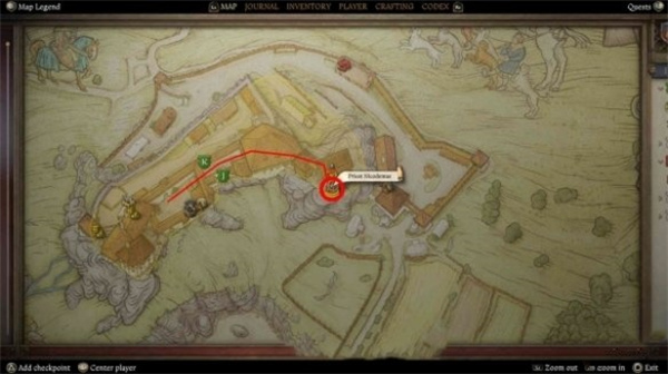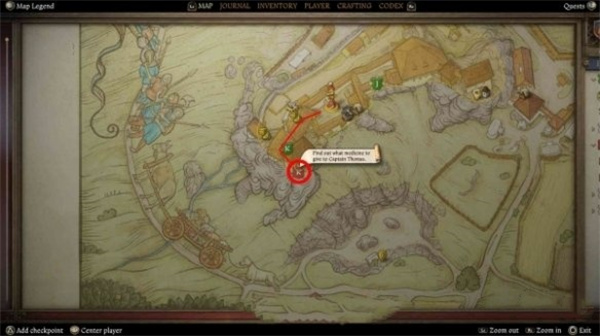 2、我们需要治疗生病的托马斯上尉,这一步需要我们前往特罗斯基城堡西翼的顶部,顶部的房间中可以找到炼金术台,然后再长凳左边架子上获得医师的日记,接着就可以找到药剂配方。