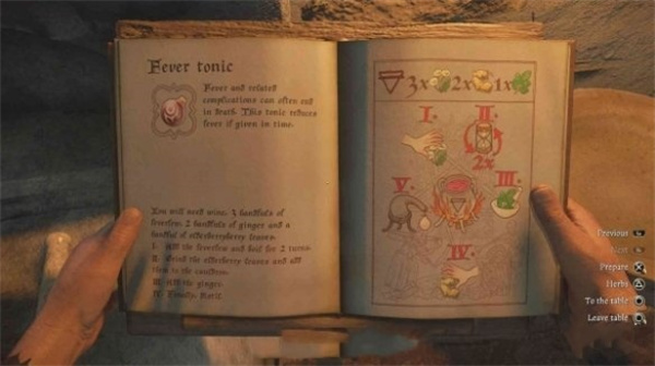 4、接着我们在炼金台上制作发烧治疗药水,首先我们需要将左上架子红色花瓶里的酒倒入大锅中,然后放入三个银莲花,随后搅拌一下,转动沙漏接着使用风箱加热大锅,等沙漏流完后,取一个接骨木放进研钵并将他捣碎,随后倒入锅中,紧接着放2个生姜,最后拿起小瓶使用蒸馏器来提炼药水。