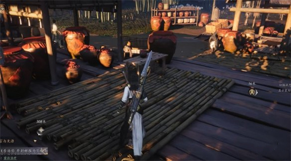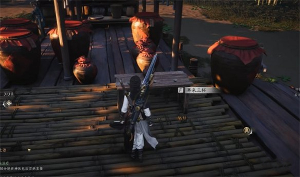 接着我们在竹林附近找到路边的酒肆,并在里面寻找到放着一坛酒和三碗酒的桌子。