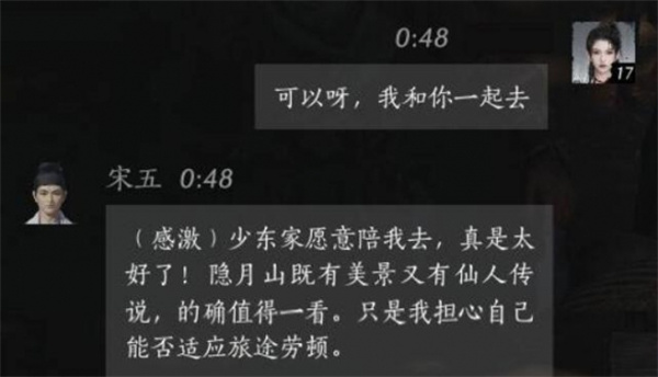 3、接着玩家对话选择陪她一起去隐月山就行了。