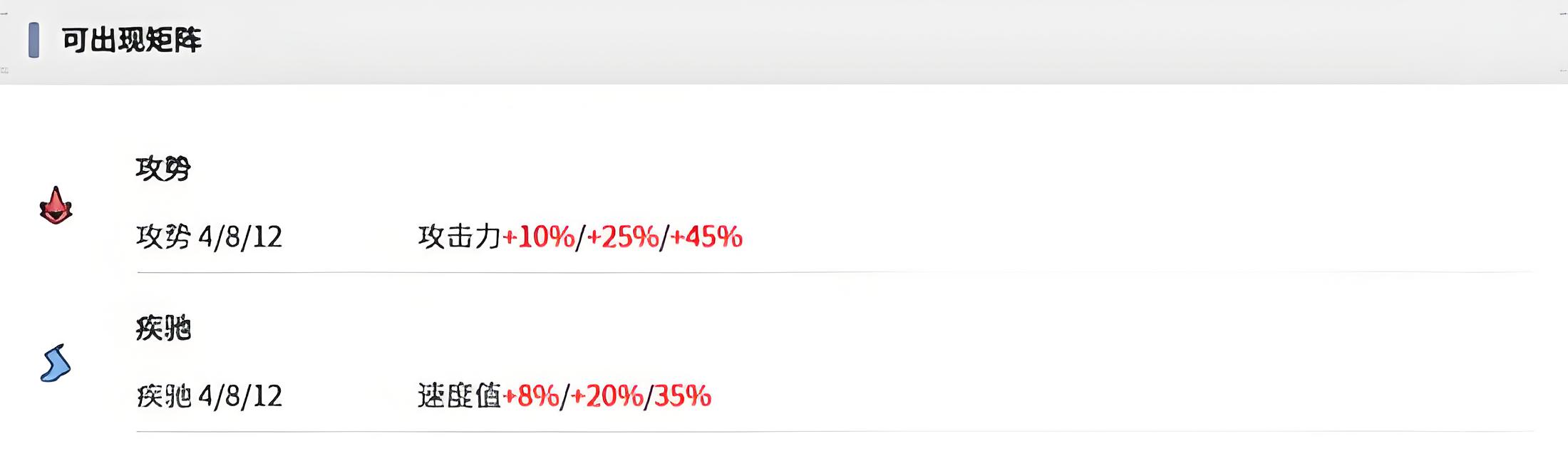 3、矩阵选择推荐乘势追击暴烈利刃和疾驰固定搭配,三者各提供3点属性加成,剩余8点靠源器或元气系统补足,可缩短金狮子成长周期。