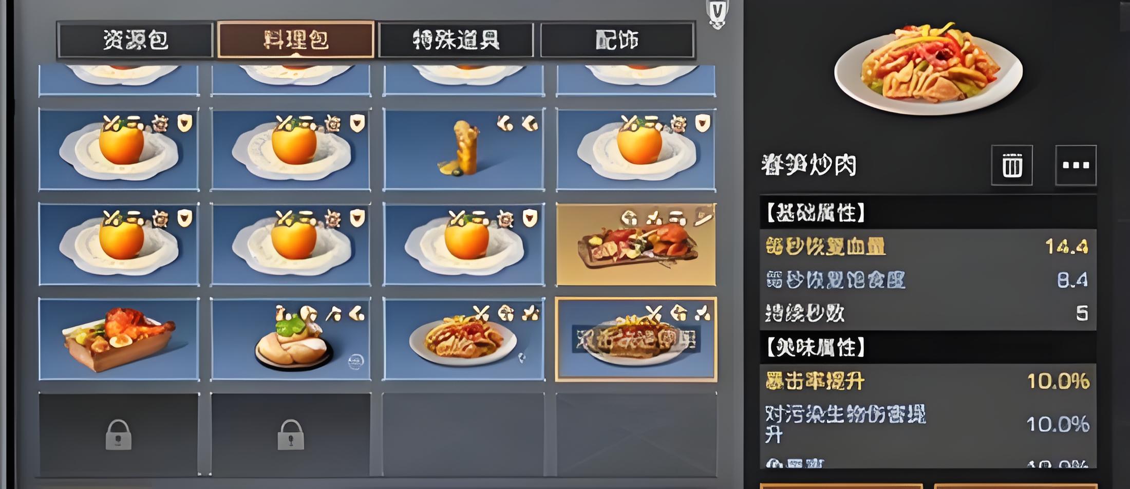 3、主要用途是制作春笋炒肉食谱,该食谱能为玩家提供基础属性加成,每秒恢复14点4血量和8点4饱食度,持续5秒。