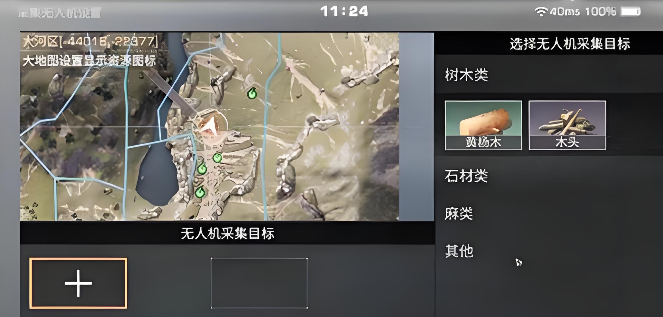 4、辅助采集可在大地图设置里开启显示资源图标,或使用无人机选择合适采集目标,如树木类、石材类等,提高寻找效率。