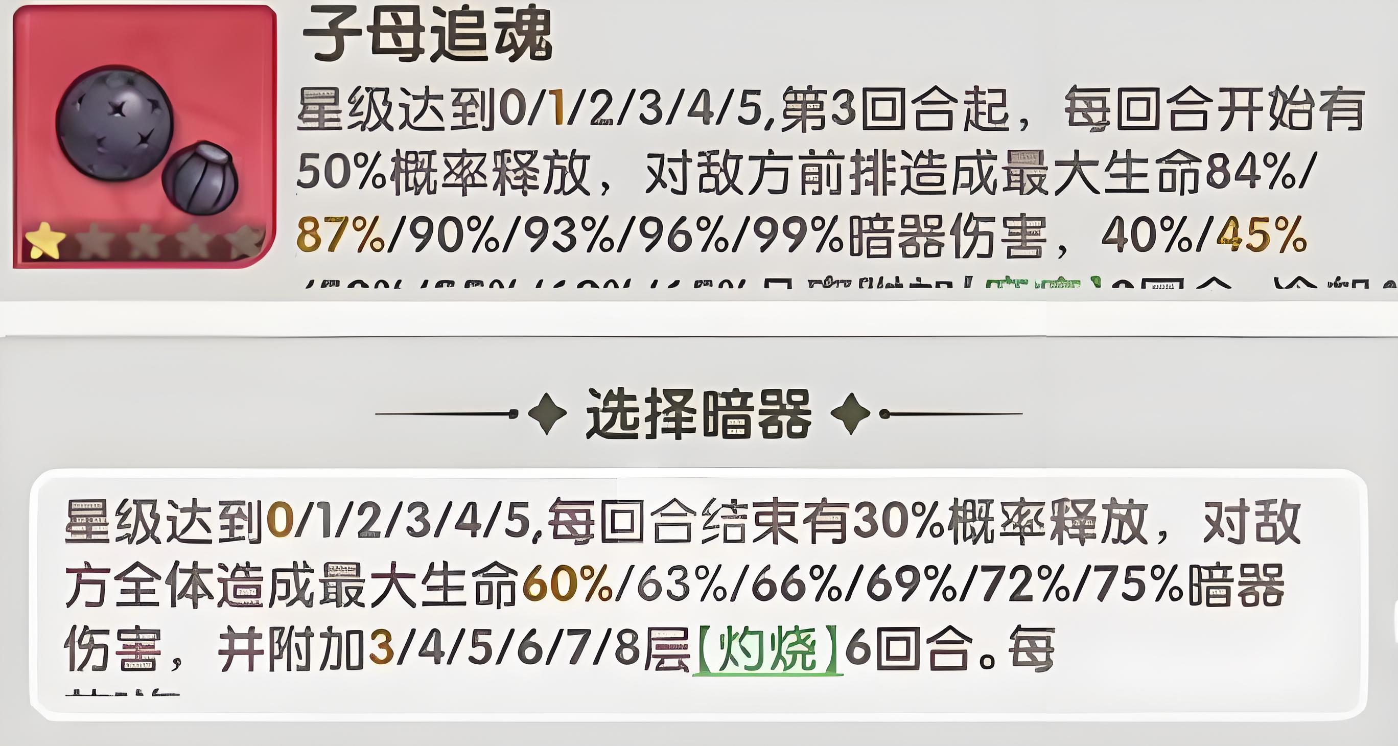 2、子母追魂有追踪性和爆发力,第三回合起每回合概率触发,攻击敌方前排并附加麻痹状态,冷却两回合,能打断技能、限制关键角色行动。