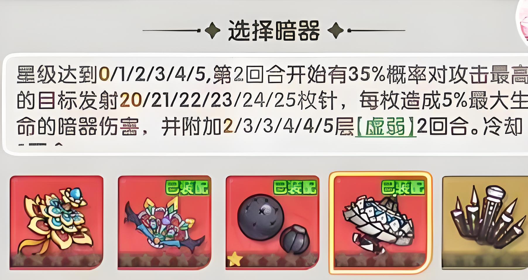 1、孔雀翎是唐门经典暗器,激活后第二回合起概率发射钢针,造成目标最大生命值百分比伤害,还能提升全队攻击力,适合远程压制高血量阵容。