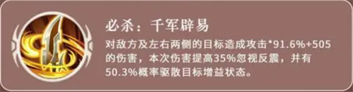 这个技能使用的时候,可以对敌方以及他左边和右边两个敌军的目标,一共3人造成攻击,攻击数值的话,基础的是有91%的数值,然后加上505的固定数值,那么这一次的伤害后期还可以提升35%的忽视效果,这里忽视的效果一般是针对于反震的,并且同时还有50%左右的概率,可以去驱散掉敌人身上的一些增益状态,不过驱散的数量不多,那么他在被动上面有一个折冲防御的效果,这个折冲防御也是针对于忽视反震的效果,触发的时候带来的效果是很不错的。
