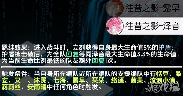 现在大家想用泽音来组建阵容的话,这里推荐她一起配队的还有柚恩+露早,其中的泽音作为辅助,她可以触发一个往昔之影的羁绊,这个羁绊的能力是在刚开始进入战斗时就可以触发的,此时泽音会获得根据自己最大生命值5%的数值放出来的护盾,这个护盾会抵御敌人的攻击,只要是护盾被敌人击破,那么泽音就会给全队都带来一个回复的效果,且根据生命数值最低的一个队友带来额外的回复次数,这样血线有了泽音的技能保障,加上柚恩以及露早的输出就不用担心阵容强度啦。