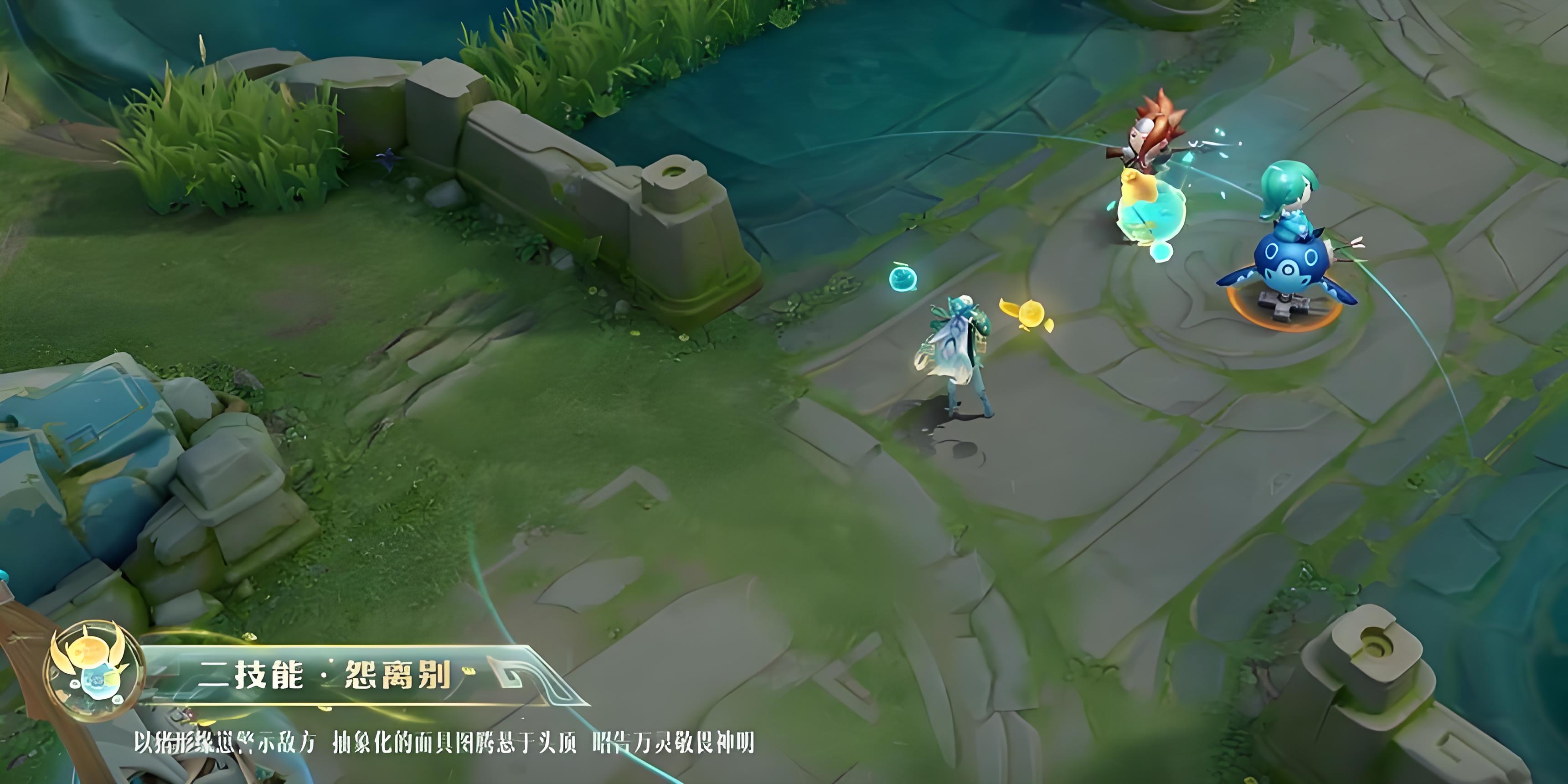 2、一技能释放时以鸟形缘崽向友方传递音波,信仰之力会汇聚在少司缘头顶铜铃,铜铃表面还会显现符号化青铜跪坐人像纹样。