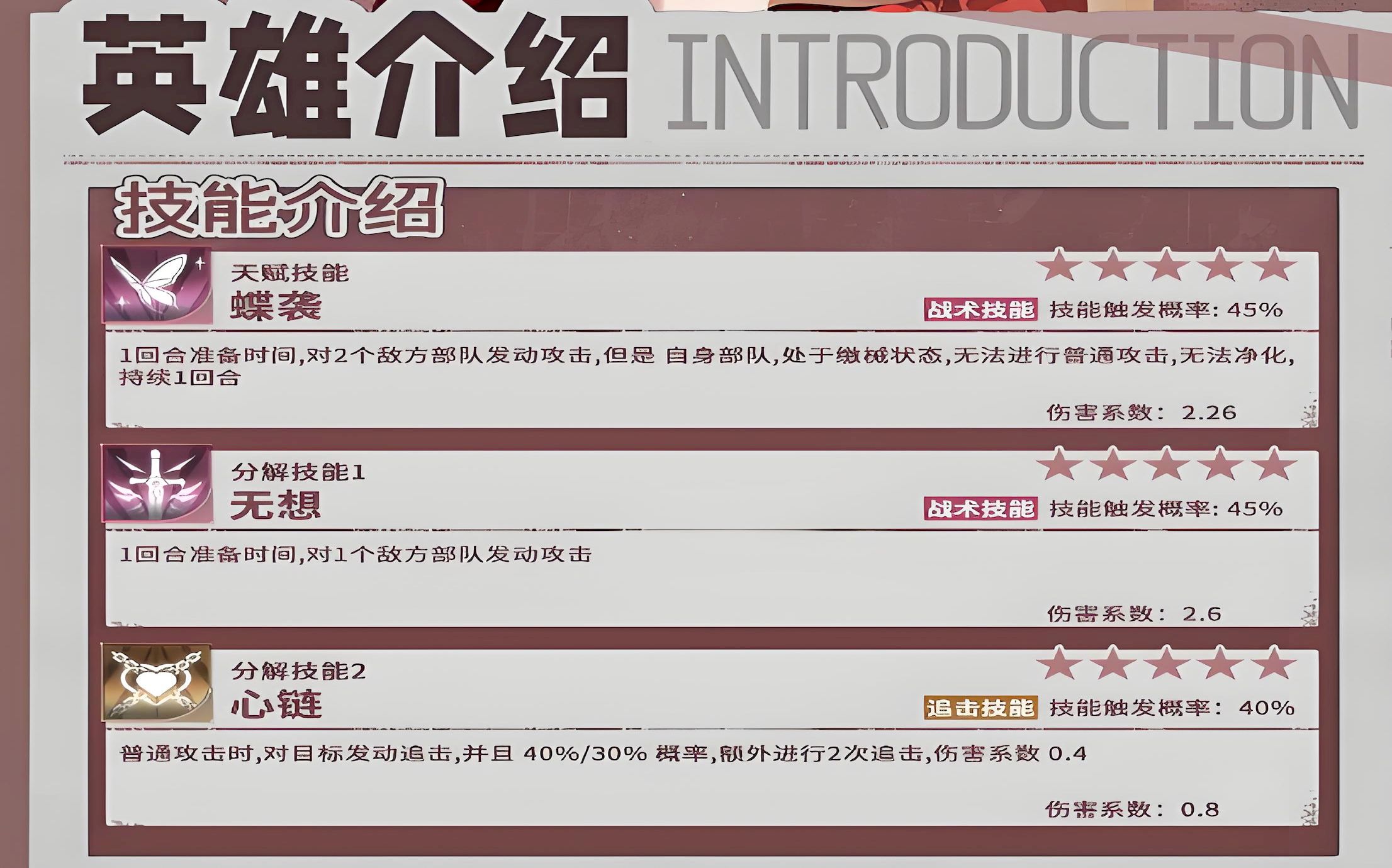 1、瑟拉拥有天赋技能蝶袭属于战术技能,需要1回合准备时间对2个敌方部队发动攻击,自身部队会进入缴械状态且该状态无法净化持续1回合。