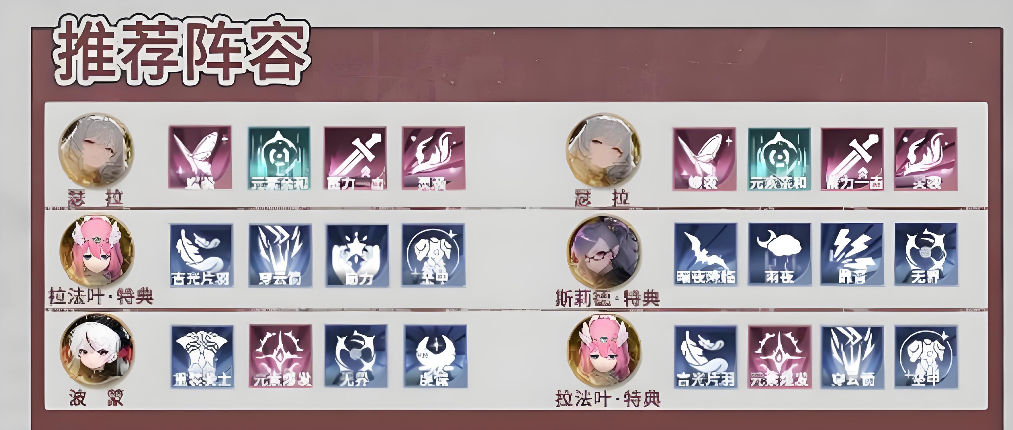 4、瑟拉推荐搭配角色暗夜畸临斯莉德特典、雨夜融音、无界、吉光片羽拉法叶特典,还可结合对应装备或效果进一步提升整体战斗能力。