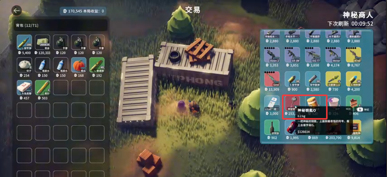 3、提现之后,你提现的金额就会到你的背包里面,存够足够的钱就可以去【神秘商人】那里买物资了。农场镇的神秘商人就会刷神秘钥匙x和神秘钥匙o